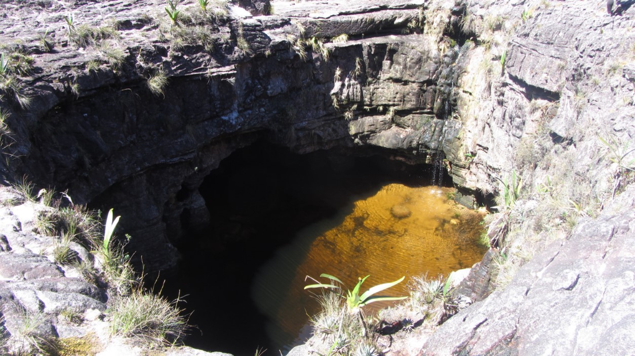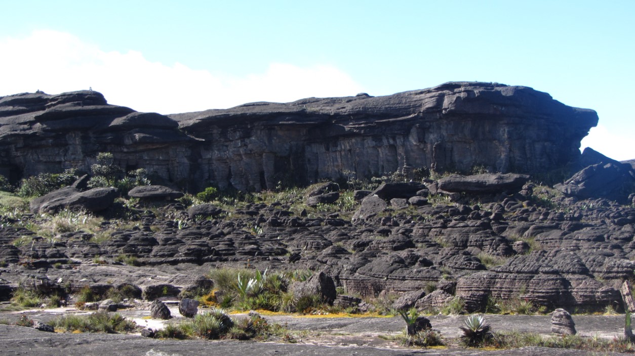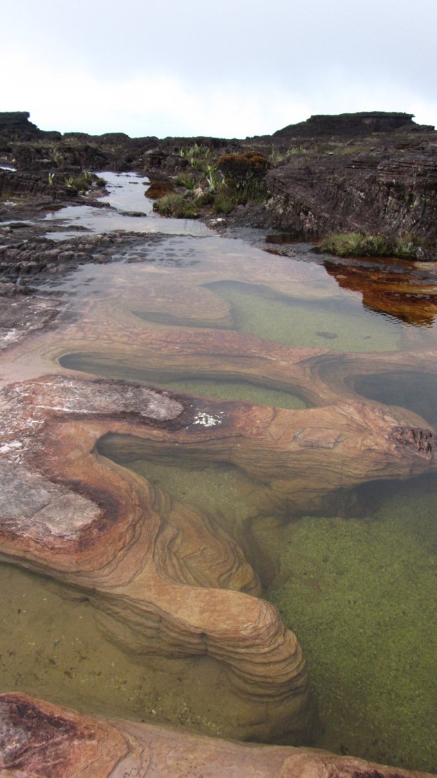 O topo do Monte Roraima é uma imensidão e definitivamente você tem certeza que caminha sob algum outro planeta. A natureza é muito diferente e isso me fez ir longe na imaginação. Não há vestígios de fósseis, somente as rochas e as suas esculturas. Não vi animais, a não ser pequenos sapos negros e com a barriga amarela. Estranho esse planeta com rochas, sapos pretos e muita água!