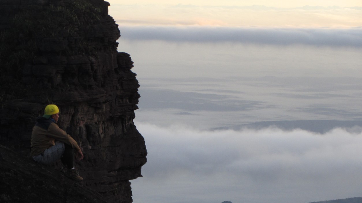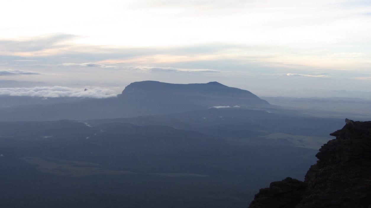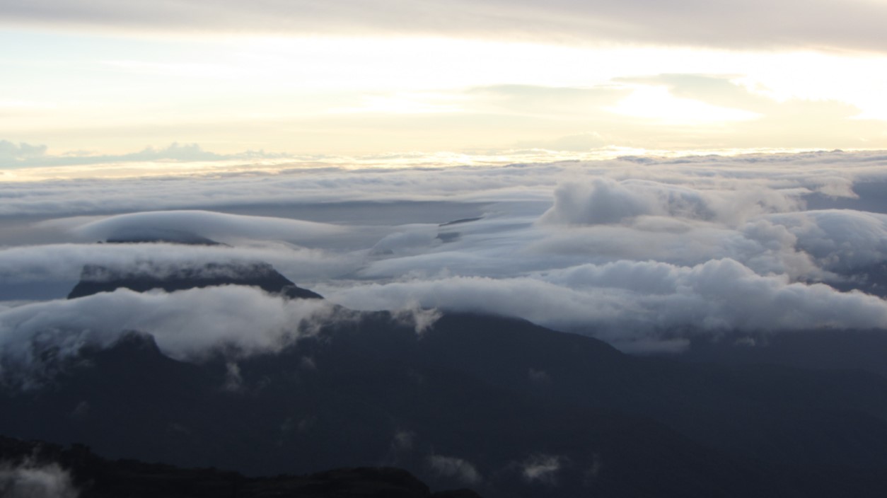 Como de hábito durante toda a expedição, acordamos às 5h30 da manhã. Mas, hoje nós tivemos aquele presente dos deuses: um lindo amanhecer do lado brasileiro do Monte Roraima. Olhar o Wey Tepui ao meu lado esquerdo e do direito a Reserva Raposa Serra do Sol, além de toda aquela vegetação densa e vasta do Brasil, foi demais. Era hora de agradecer mais uma vez. Fazia muito frio às 6h da manhã e para completar o incrível carinho da equipe da expedição com a gente, recebemos a surpresa de um dos carregadores, o Mário, chegando com café e chá quentinho para o grupo (bem naquele momento em que já pensávamos… vamos embora que o frio está incomodando?).