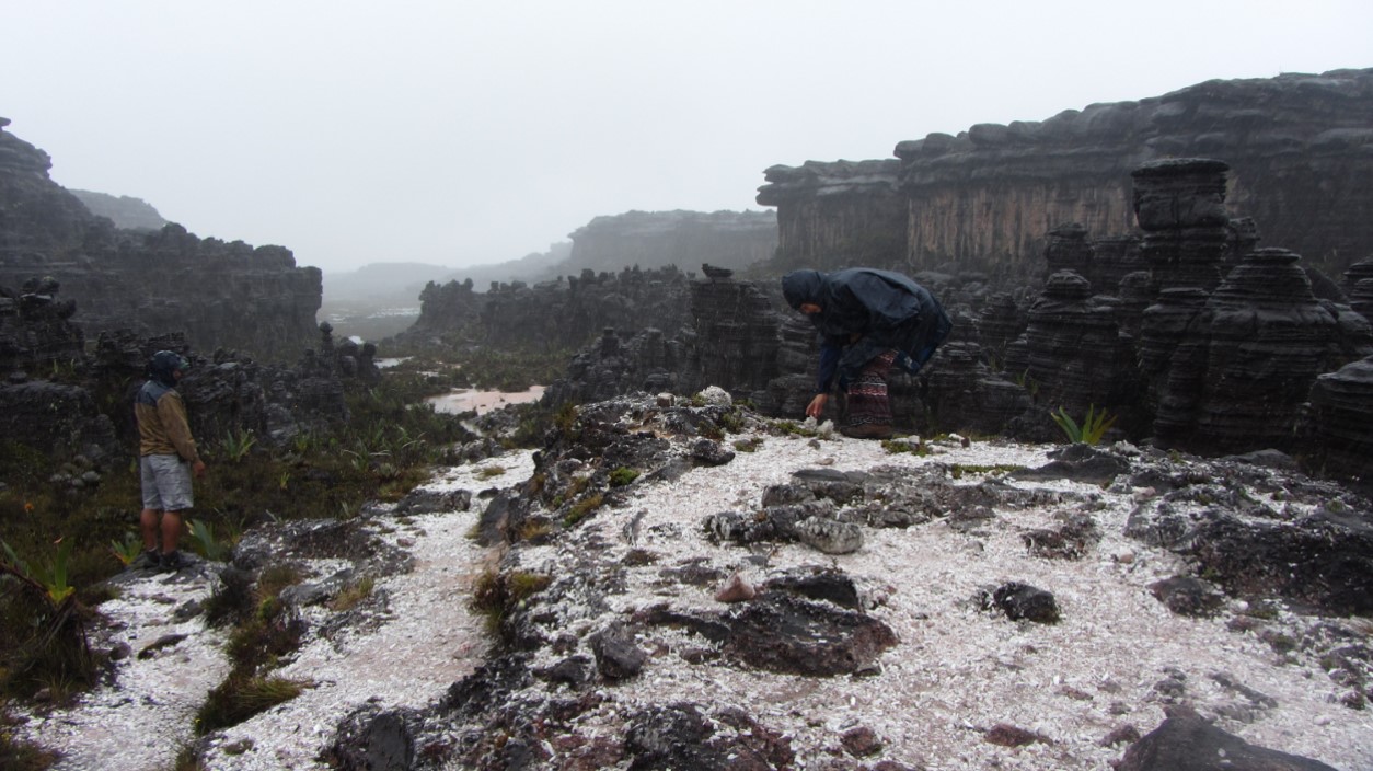 As nossas preces não foram atendidas. A Chuva apertou na noite anterior e assim permaneceu por todo esse dia. A intenção era passar no vale dos cristais, no fosso (para tomar aquele banho que ficou prometido no nosso retorno) e ir ao Maverick (o ponto mais alto do Monte Roraima com 2875 metros). Estivemos no vale dos cristais, que é lindo demais! Passamos pelo fosso, mas com toda a queda d’água, já não daria mais para tomar banho ali, e nem tentamos ir ao Maverick. O cansaço tomou conta da gente. Caminhar 12km praticamente sem descanso e com péssima visibilidade e muita chuva e frio nos fez seguir direto para o Hotel Índio. Ninguém fez objeção à essa decisão.