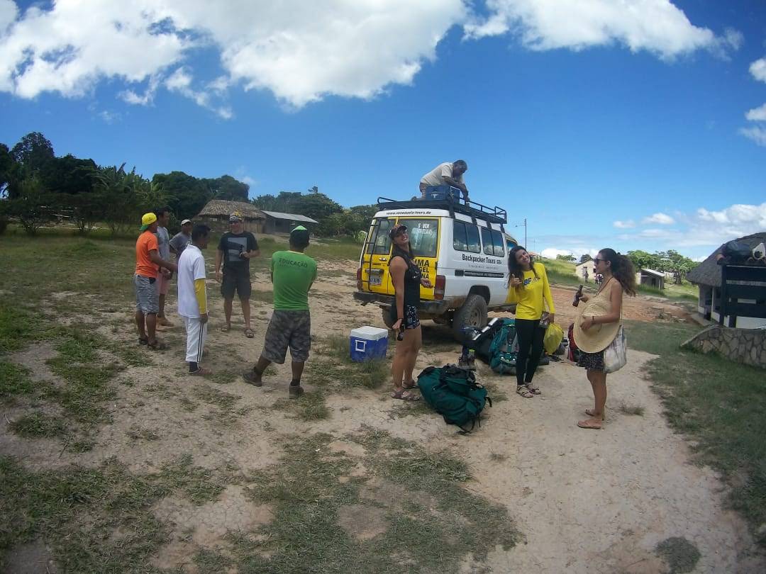 Pela programação inicial, sairíamos de Santa Elena às 9h30. Mas, com todos os imprevistos que tivemos com o nosso voo (um agradecimento especial à LATAM por atrasar voos, desrespeitar o consumidor, e acabar com todo o planejamento inicial, atrasando em 1 dia a nossa chegada em Santa Elena), retardamos a saída do grupo. De Santa Elena a Paraitepuy são mais 2h de carro. É longe e só se chega em carro 4X4. Há trechos de dar medo!