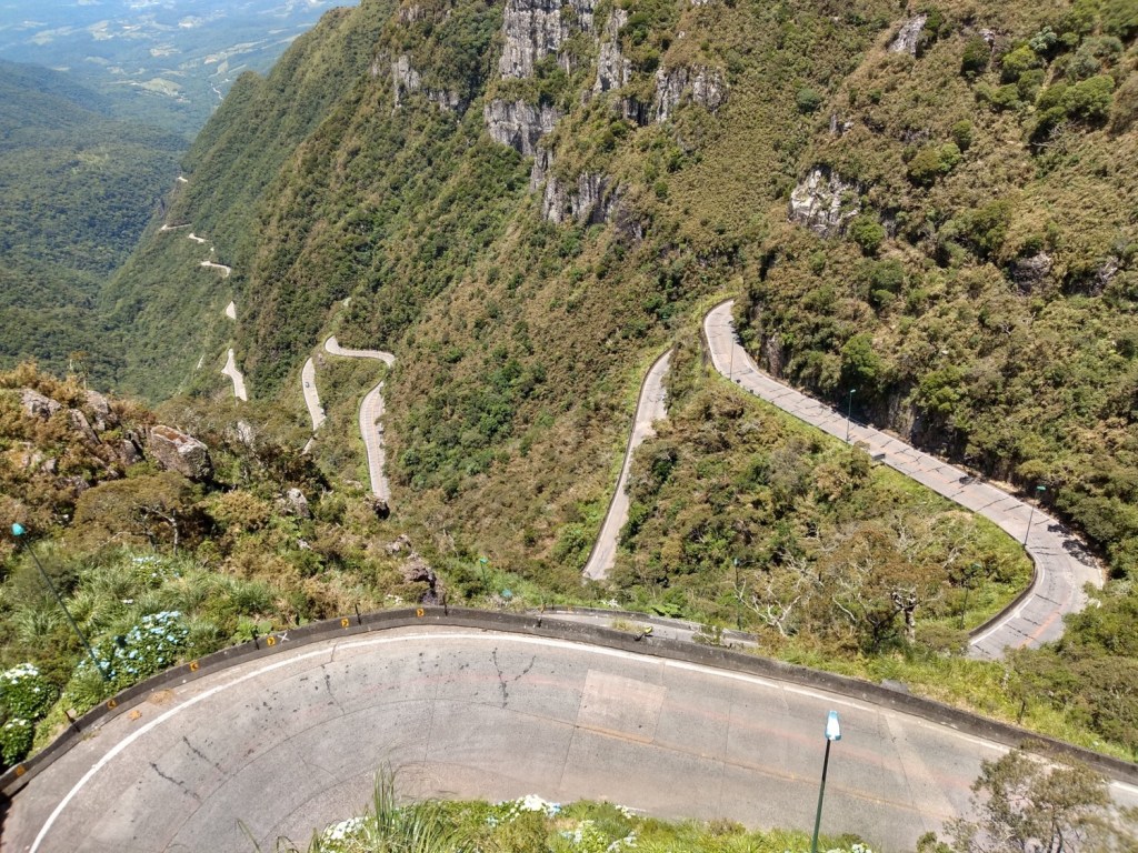 Da Cascata da Barrinha para a Serra do Rio do Rastro. Que visual! O mirante é incrível, estrutura maravilhosa e o encontro de todos que passam por ali. Seja por ônibus, carro, moto ou bicicleta. A pausa para muitas fotos e, claro, aquele momento em que começamos a descer a estrada sinuosa, ouvindo uma boa música e só curtindo o caminho.