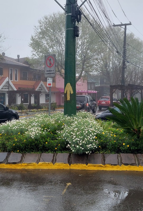 O trecho 1 é praticamente plano e o caminho é todo pela cidade e estrada com alto fluxo de carros. Deu muito desânimo estar ali no frio, caminhando debaixo de tanta chuva e sem uma paisagem natural. Nunca vi tantas lojas, museus e construções megalômanas num percurso tão curto. Las Vegas do Brasil?