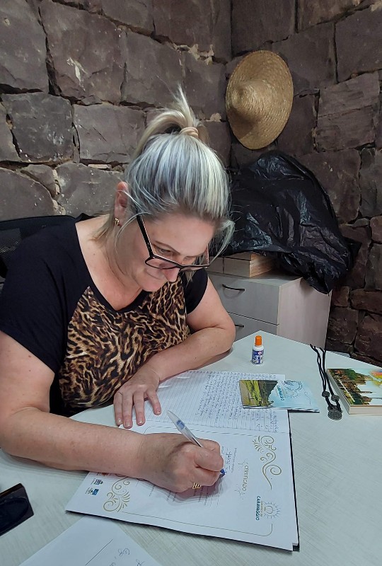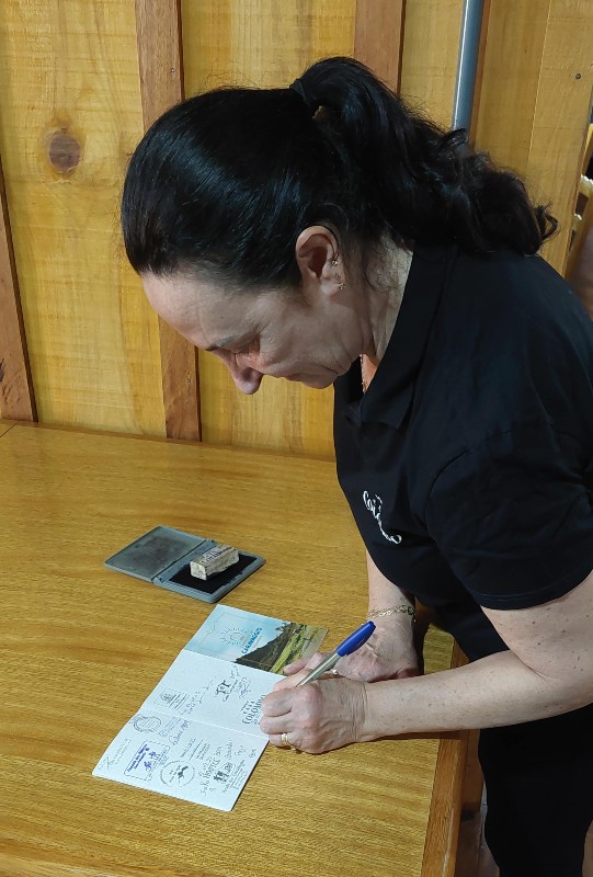 Logo no início do trecho fomos abordados pelo Sr. Guerino que passava de carro e disse que nos esperava em seu bar no km 2 do percurso, para carimbar o nosso passaporte. Ele gosta de conversar e conhecer pessoas então esteja preparado para o bate-papo e se possível tomar a graspa (cachaça de uva) ou umas doses dela. Como eu não tenho afinidade com bebida destilada, pedi ao Gabriel para beber por ele e por mim, enquanto lia as mensagens dos peregrinos que já haviam passado por ali e fazia o meu carimbo na parede do bar.