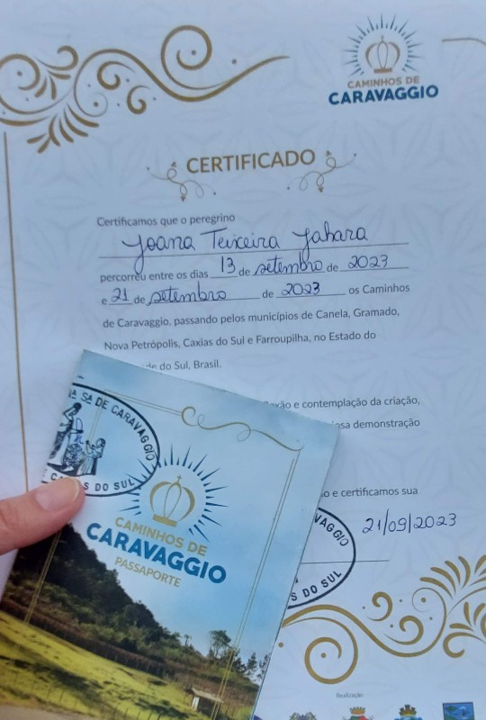 De olho no mapa e altimetria, a última parte é de muita subida e esperava por algo bem ruim e exaustivo, mas foi mais suave do que imaginava. Se não tem subida, não é Caravaggio (já disse isso em algum momento) e com certeza essa não foi a mais difícil desses 200km! De longe avistamos o Santuário, faltava uma reta somente, e ao chegar fomos direto carimbar pela última vez o passaporte e retirar os nossos certificados. Foi gratificante o acolhimento final do Santuário ao nos receber. Tocamos o sino e teve registro!