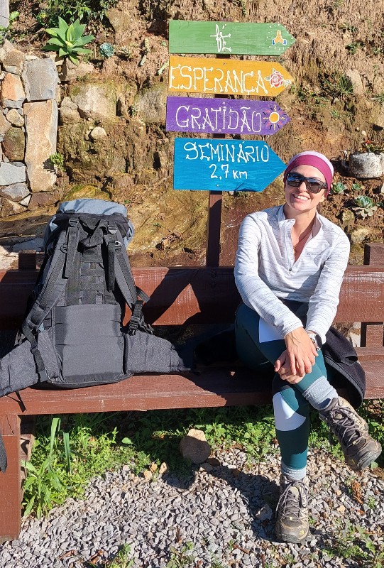 O lado positivo foi ouvir muitas buzinas dos motoristas para a gente e inclusive ver pessoas parando o carro no acostamento para perguntar se precisávamos de bebida ou comida. Foi tão bacana sentir essa energia e perceber que muita gente sabia que aquele ali era um dos trechos da rota de peregrinação.