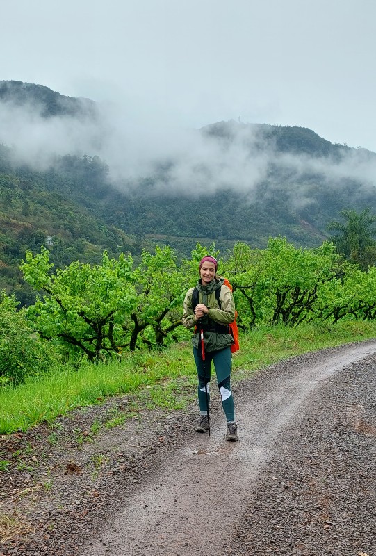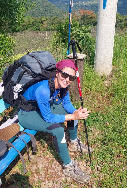 Passavam alguns quilômetros e as dores no calcanhar intensificavam, ainda bem que esse trecho é só descida com boa parte plana, o que amenizou o meu desconforto. Eu demorei a entender que o não-revezamento de mão com o bastão (sou destra) estava jogando o meu peso para o lado esquerdo do corpo e como consequência disso o inchaço no pé e dor no calcanhar.