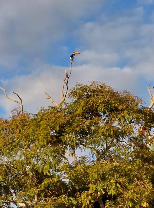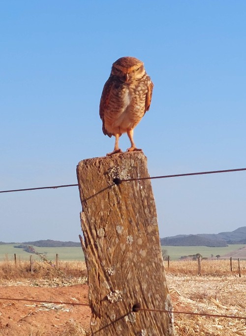 O cenário muda um pouco, pois não há mais gado como antes e a agricultura vai ganhando um espaço maior pelo caminho. As corujas finalmente apareceram, já estava ficando frustrada por não as ver de perto (só porque eu as acho lindas). Curioso que por todo o caminho não encontramos animais perigosos, não que eu lamente por isso, mas nem uma cobra. Faziam dias de tanto calor que nem as cobras quiseram saber de sol. Além do gado, a variedade ficou por conta das aves: tucanos, maritacas, araras, pica-pau e alguns outros que não consegui identificar.