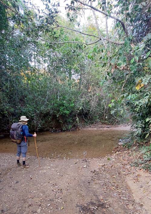 Da saída da pousada até atravessar o córrego, passagem obrigatória do caminho, são 200m de distância. Vá de chinelo e depois calcem as botas. É uma trabalheira danada se preparar toda para logo ali na frente tira-la e segundos depois ter que calçar novamente.