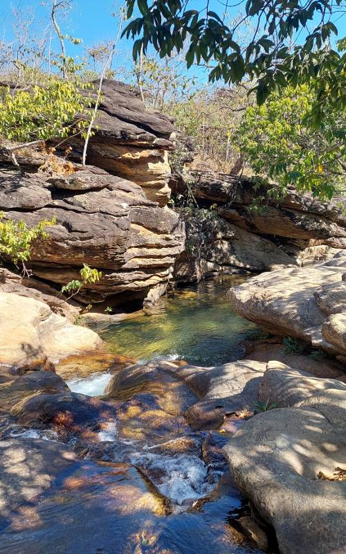 Atravessamos o Parque sem dificuldades no trajeto em si, mas, na verdade, era nosso primeiro dia à prova da bola de fogo (o sol). Da guarita até o mirante, caminha-se por uma estrada de terra com pouca elevação e bem sinalizada. Não tem como errar. Uma pausa no mirante para apreciar Pirenópolis e a partir dali, pega-se um acesso que sai da estrada principal e entra numa trilha, uma das poucas que se faz por todo o caminho. Ao cruzar um trecho de água, ali quis ficar. Definitivamente eu sou da água e onde puder me banhar, irei. Gelada e bem contrastante com aquele calorão.