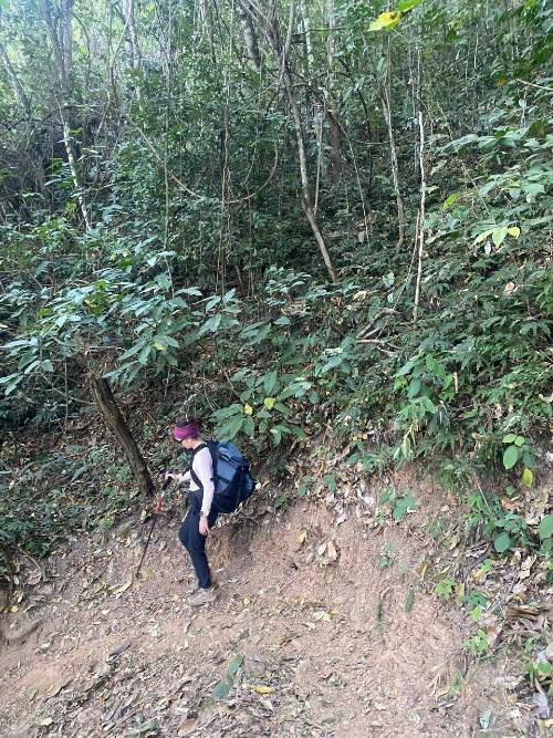 Último dia, último trecho, mas apesar das dores fortes no quadril e desconforto na panturrilha direita, que parecia estar na iminência de câimbra, foi uma caminhada a passos rápidos. Passamos pelas ruínas de Ouro Fino, que é interessante, mas ao analisar de uma forma geral o ponto turístico para visitação, a estrutura é mal feita e acabada, inclusive com pedras soltas (não estou falando das ruínas). O pessoal que instalou os bancos para apreciar as ruínas devem ser os mesmos que instalaram os bancos pelos trechos: todos posicionados no sol. Além disso, mesmo sendo uma obra recente (inauguração datada de 2023), já está mal conservada devido ao mato alto.