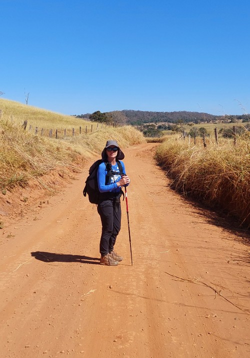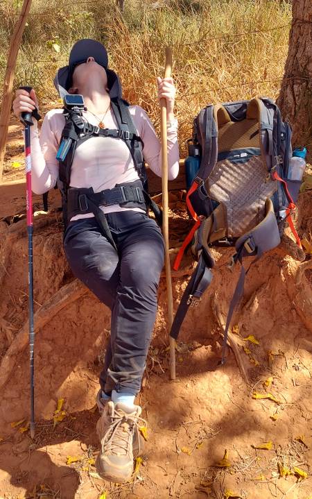 Saíamos cedo, mas não antes de amanhecer. Durante as primeiras quatro horas, ainda fresco e com mais sombras, acelerávamos o passo porque sabíamos que a partir das 10h30 o forte calor chegava e sem cerimônias. Dali adiante, me sentia arrastando correntes no cerrado. Eu que transpiro muito comecei a me incomodar com o não suar, uma agonia. Exceto pelos primeiros trechos, dificilmente se tem acesso à água pelo Caminho. Então, carregar pelo menos 2L de água na mochila é uma questão de sobrevivência. Sombra? Algo raro e os bancos para descanso dos caminhantes e ciclistas eram tão bem posicionados, que a maioria ficava justamente onde batia o sol. No início, achava engraçado, mas no decorrer dos dias fui ficando irritada com o despreparo e/ou falta de inteligência de quem o fez. Colocaram esses bancos durante à noite?